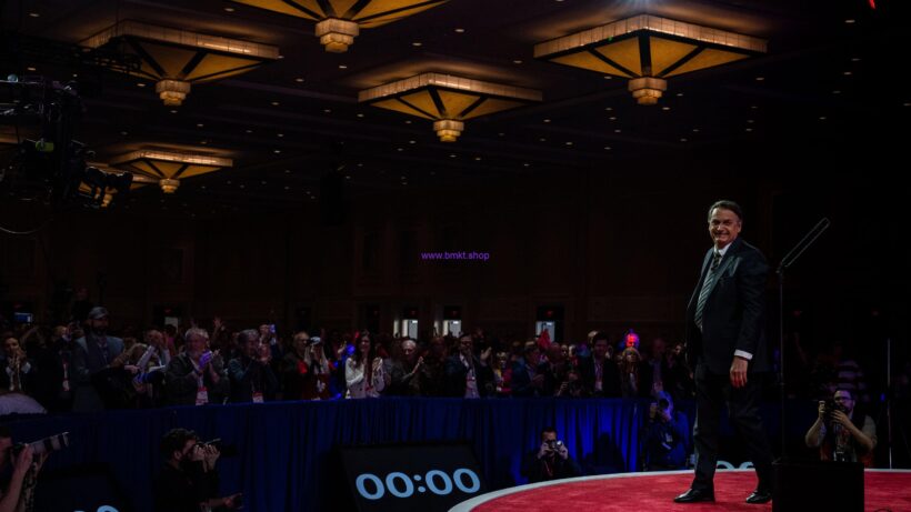 Jair Bolsonaro, former president of Brazil, standing on a red-carpeted stage in front people in a meeting hall.