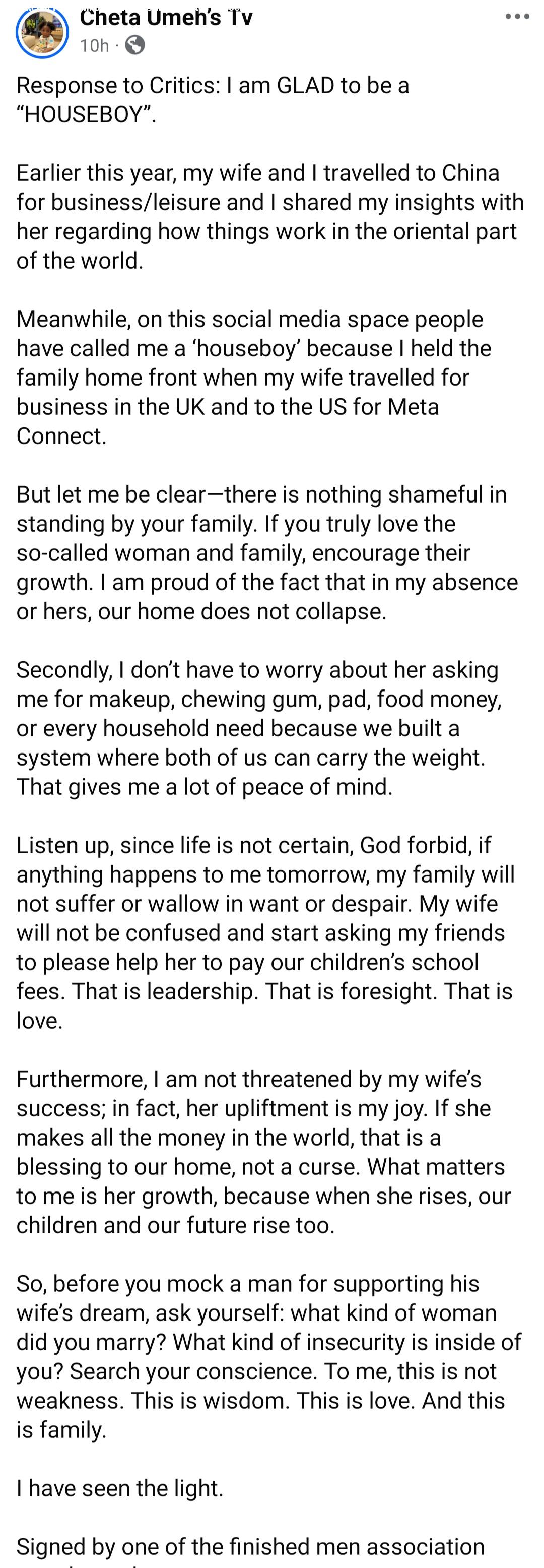 Cheta Umeh, the husband of dancer, Korra Obidi’s sister Nancy Umeh, has responded after he was shamed for staying home to take care of his family while his wife travels on business. Cheta, a businessman, responded to the critics via his Facebook account. He wrote: “Response to Critics: I am GLAD to be a HOUSEBOY. “Earlier this year, my wife and I travelled to China for business/leisure and I shared my insights with her regarding how things work in the oriental part of the world. “Meanwhile, on this social media space people have called me a houseboy because I held the family home front when my wife travelled for business in the UK and to the US for Meta Connect. “But let me be clearthere is nothing shameful in standing by your family. If you truly love the so-called woman and family, encourage their growth. I am proud of the fact that in my absence or hers, our home does not collapse. “Secondly, I dont have to worry about her asking me for makeup, chewing gum, pad, food money, or every household need because we built a system where both of us can carry the weight. That gives me a lot of peace of mind. “Listen up, since life is not certain, God forbid, if anything happens to me tomorrow, my family will not suffer or wallow in want or despair. My wife will not be confused and start asking my friends to please help her to pay our childrens school fees. That is leadership. That is foresight. That is love. “Furthermore, I am not threatened by my wifes success; in fact, her upliftment is my joy. If she makes all the money in the world, that is a blessing to our home, not a curse. What matters to me is her growth, because when she rises, our children and our future rise too. “So, before you mock a man for supporting his wifes dream, ask yourself: what kind of woman did you marry? What kind of insecurity is inside of you? Search your conscience. To me, this is not weakness. This is wisdom. This is love. And this is family. “I have seen the light. “Signed by one of the finished men association members aka Brocode.” Nancy also responded to the critics. She shared a photo she took with her husband and wrote: Houseboy and house girl association chapter leaders. The post Korra Obidi’s brother-in-law responds to those calling him a “house boy” for staying home with his kids while his wife travels on business appeared first on TIME.I.NG.